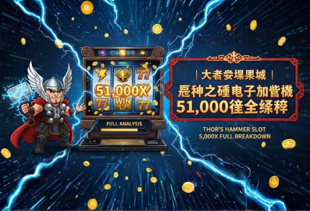 在眾多線上老虎機中,**《雷神之錘》**可說是兼具 刺激遊戲體驗、高爆發潛力與創新機制 的代表作之一。這款由 RSG 電子 開發的熱門老虎機,在 大老爺娛樂城 平台深受玩家追捧,主打 全盤倍數、消除掉落與免費遊戲累加機制,最高可贏取 51,000 倍獎金 的巨大回報。本文將全面解析這款遊戲的特色、玩法機制、免費遊戲規則與實戰技巧,讓你從新手快速進階成老司機。